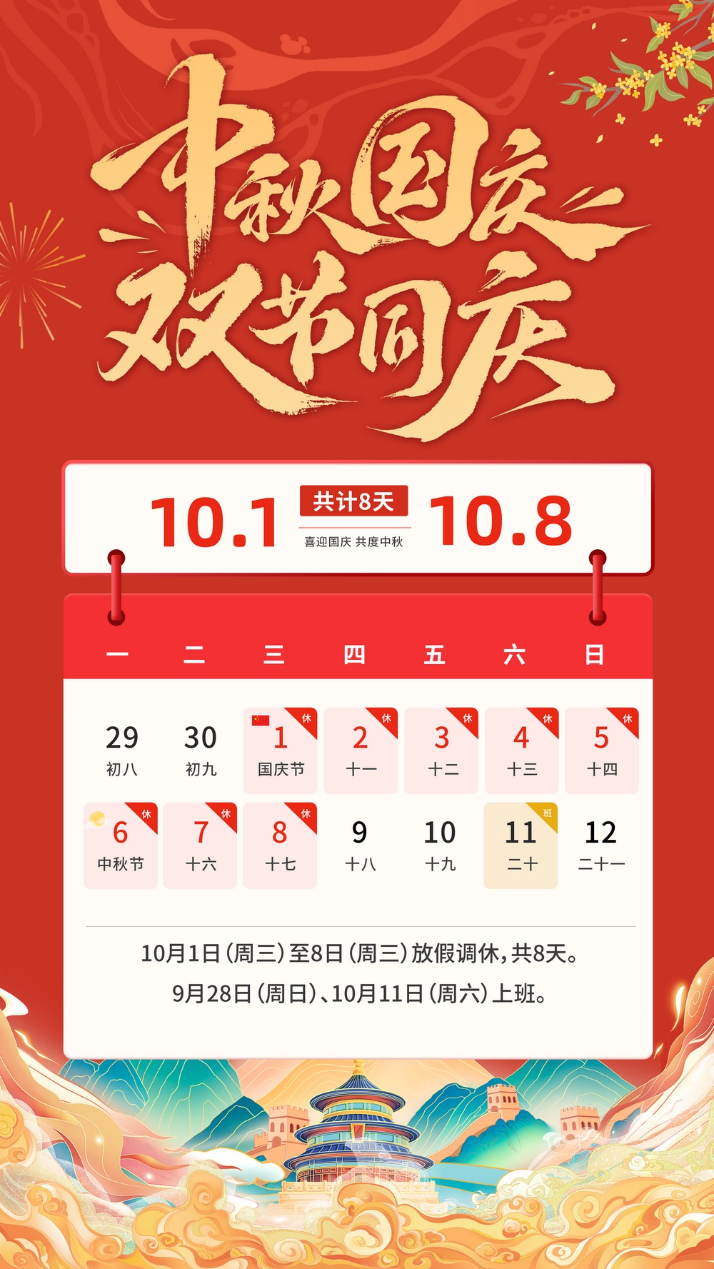 根據(jù)國家關(guān)于2025年節(jié)假日安排的通知精神,結(jié)合我司實(shí)際情況,現(xiàn)將國慶節(jié)放假安排及相關(guān)服務(wù)調(diào)整通知如下:
