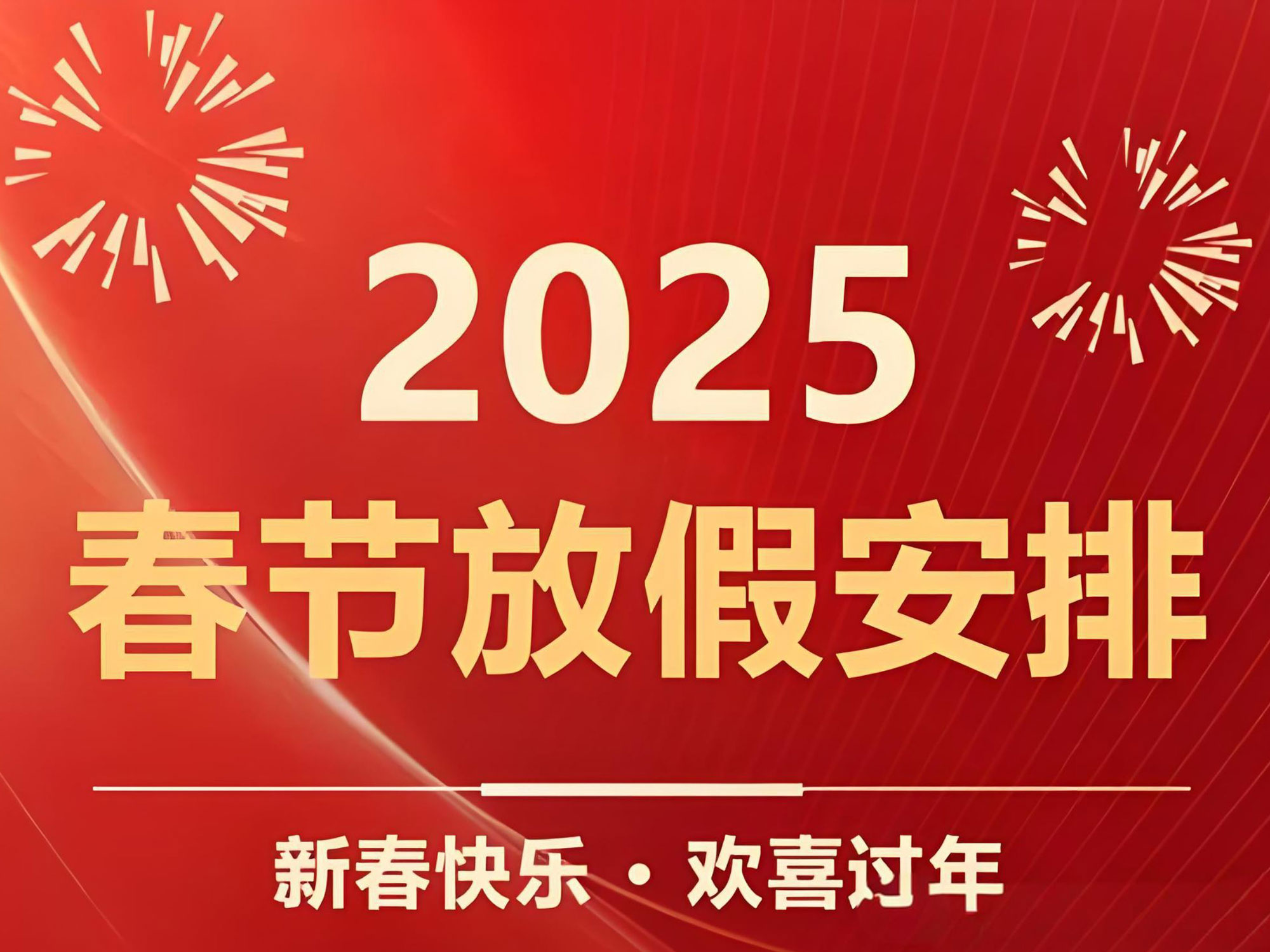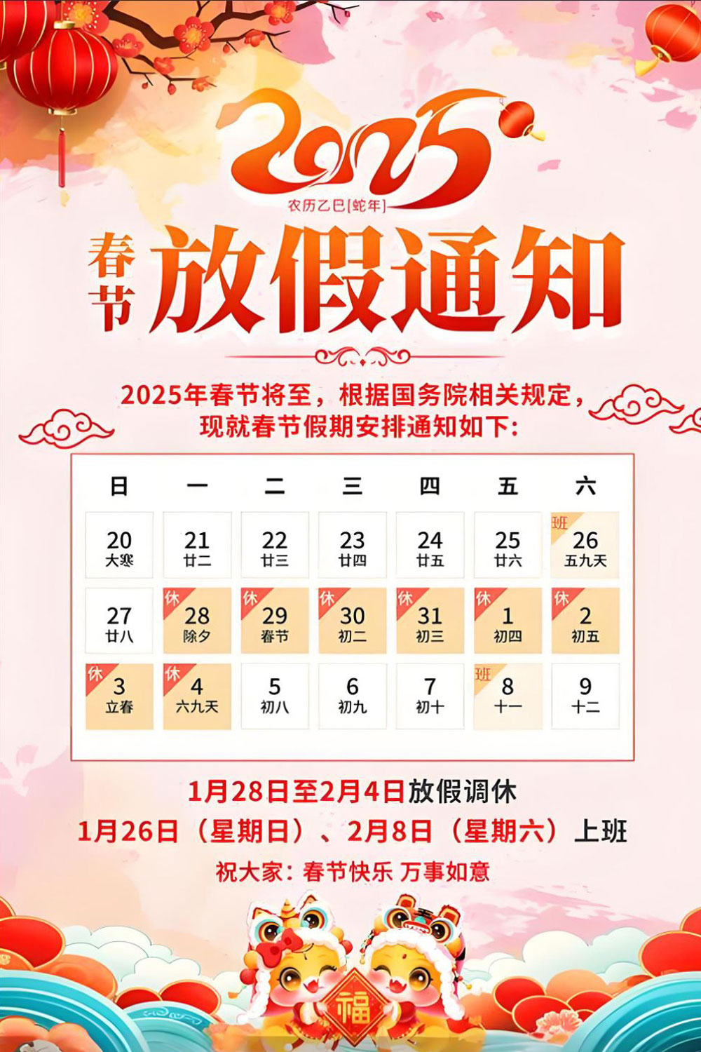 值此2025年農(nóng)歷春節(jié)來臨之際,我們向您致以最誠摯的節(jié)日問候!根據(jù)《國務院辦公廳關(guān)于2025年部分節(jié)假日安排的通知》,并結(jié)合我司實際情況,現(xiàn)將2025年春節(jié)放假安排通知如下: