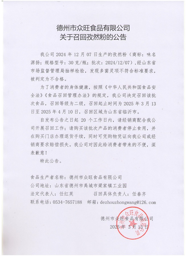 關(guān)于召回孜然粉的公告